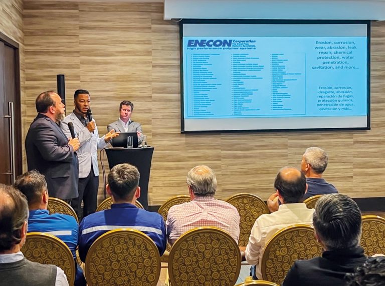 Luego, Andy Janczak Jr., Presidente de ENECON Corp., junto a Marco Antonio Grande, Vicepresidente de Ventas Internacionales, expusieron sobre la presencia y posicionamiento de la compañía a nivel mundial, y acerca de su propósito principal, que es facilitar soluciones industriales únicas para recuperar y proteger maquinarias, equipos y estructuras contra la erosión, corrosión, cavitación, desgaste, filtraciones, ataque químico, abrasión, presión hidrostática e incrustaciones minerales.