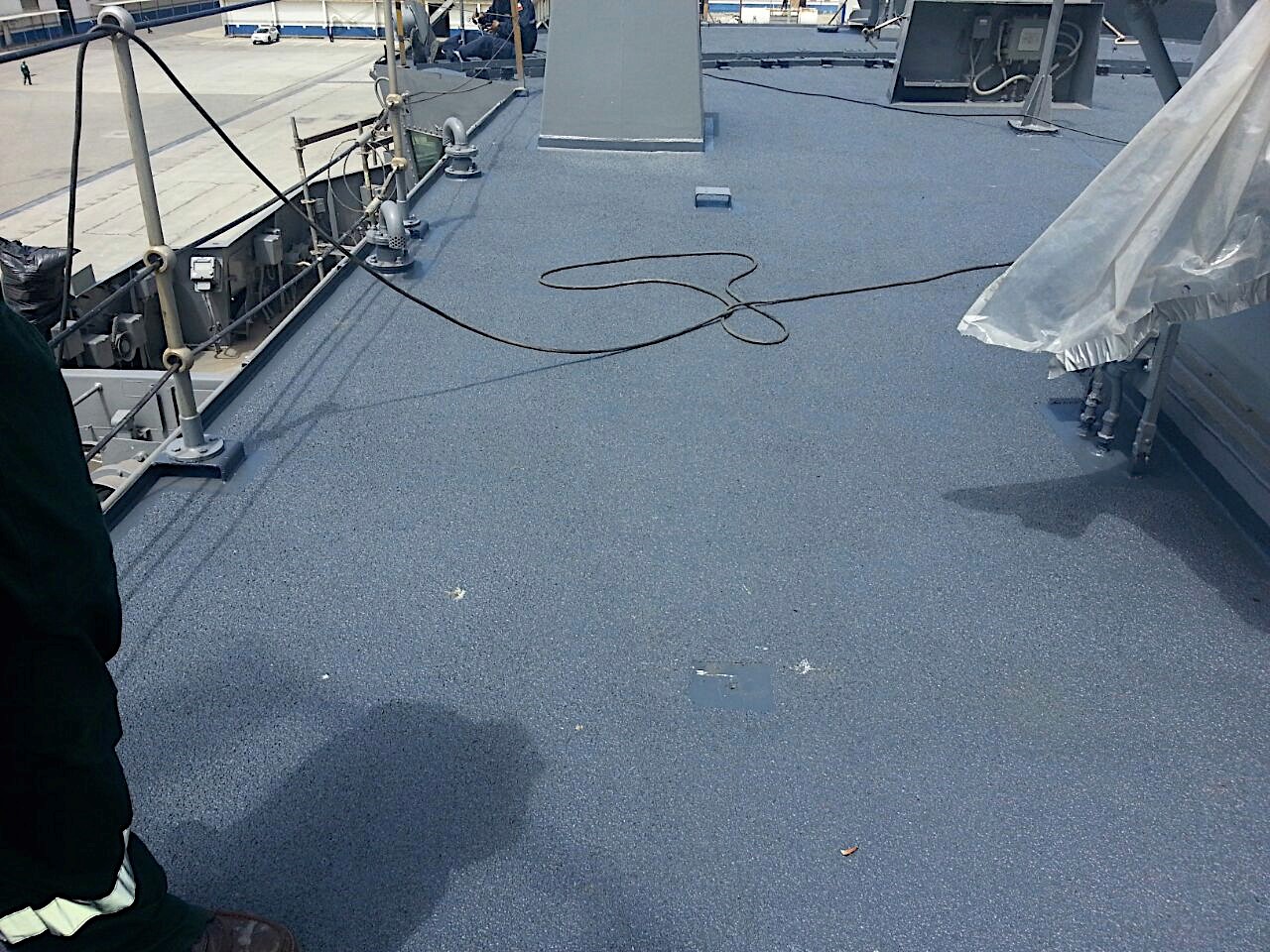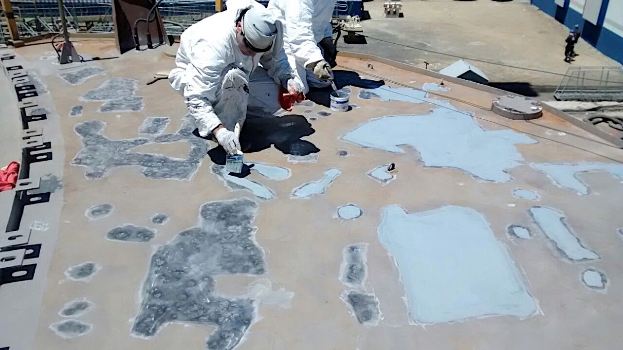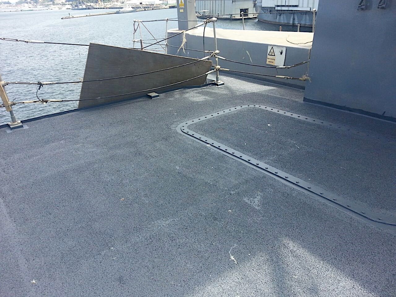 Las cubiertas de esta gran embarcación presentaban graves daños y profundas perforaciones debido a la corrosión. Reemplazar las planchas metálicas resultaba de un costo extremadamente elevado y granallar tampoco estaba dentro de las opciones por el riesgo de dañar delicados circuitos eléctricos que existen bajo dichas cubiertas. Solución: remover manualmente la corrosión lo mejor posible, para luego reparar las perforaciones con CeramAlloy CP+AC, con ENECLAD Superbond como puente de anclaje excepcional, pues no es posible granallar. Finalmente se aplicó ENESEAL CR en 4 manos con agregados de cuarzo en granulometría gruesa, con el fin de asegurar una superficie fuertemente antideslizante.