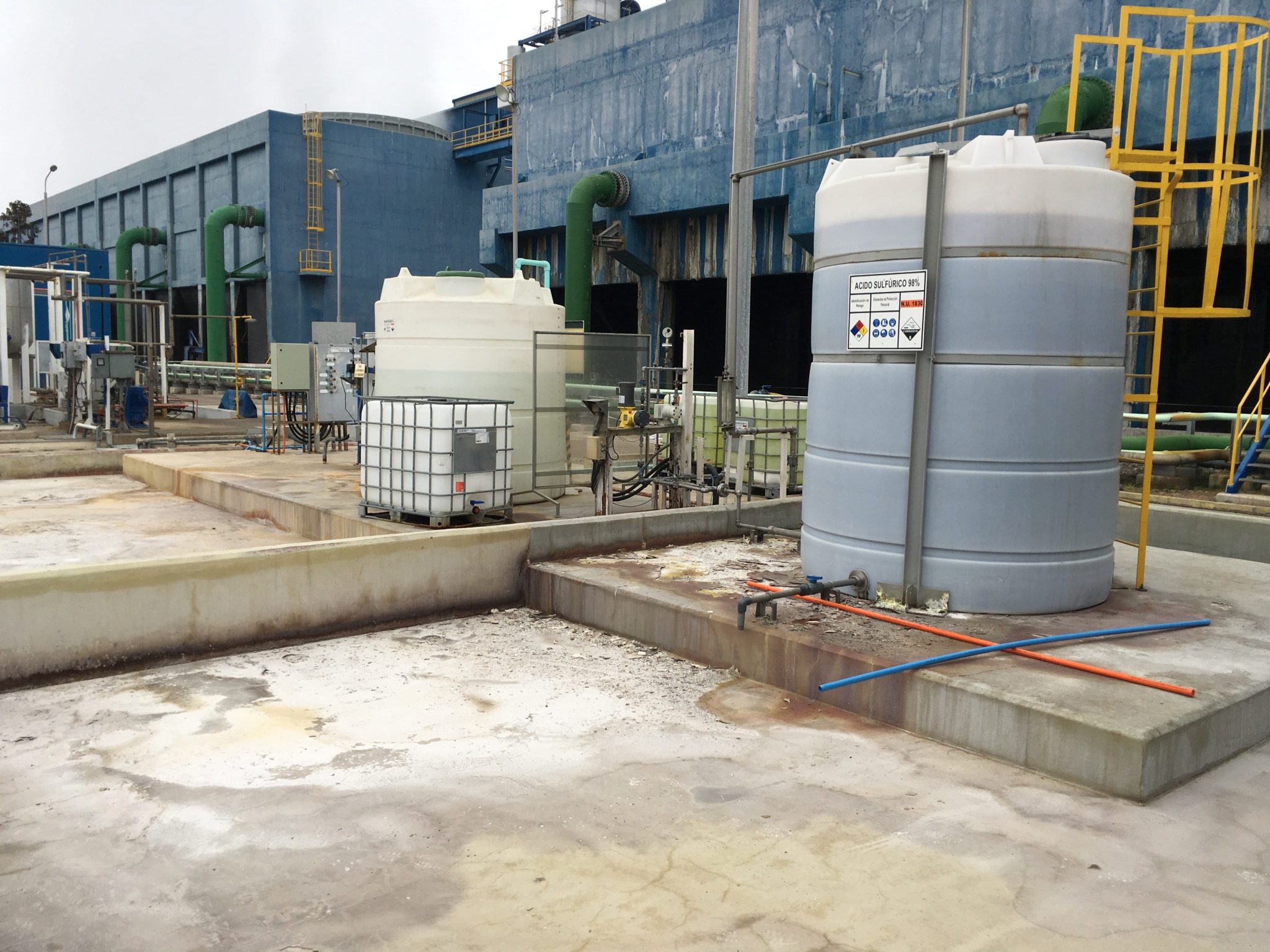 Áreas de contención secundaria de estanques de ácido sulfúrico al 98% y de hipoclorito de sodio al 10% presentan grave deterioro de los hormigones, debido al ataque químico producido por los frecuentes derrames y filtraciones de los sistemas anexos.